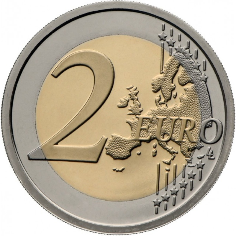 - Аверс: карта Европы с 12 звездами, номинал «2», надпись EURO, инициалы дизайнера Люк Люикс (LL).