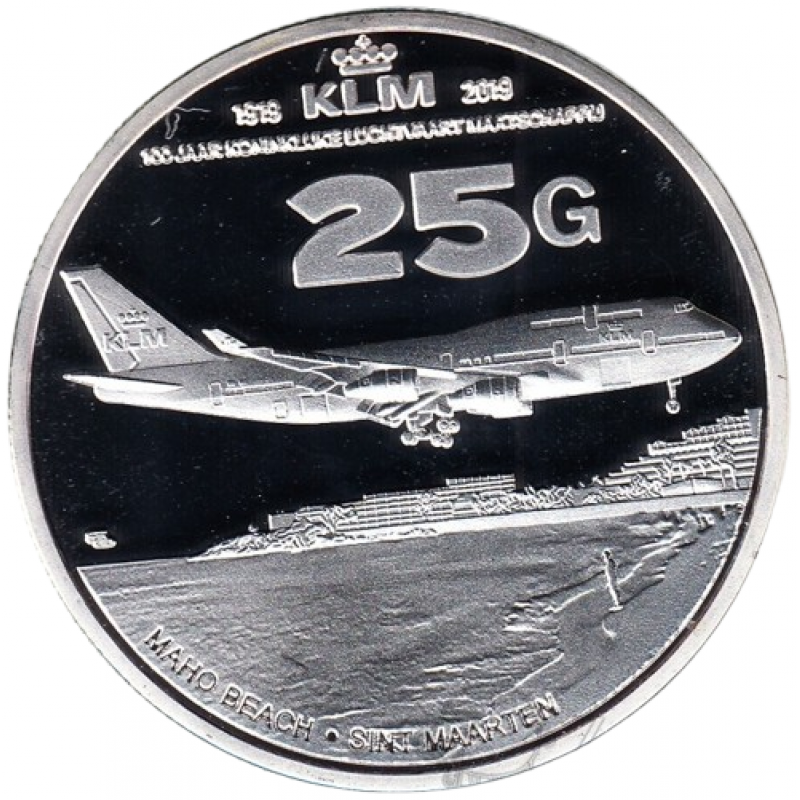 Реверс изображает низколетящий Boeing 747-400 авиакомпании KLM, заходящий на посадку над пляжем Maho Beach. В верхней части размещены королевская корона, юбилейные даты 1919–2019, надпись «100 JAAR KONINKLIJKE LUCHTVAART MAATSCHAPPIJ» и номинал 25 G.