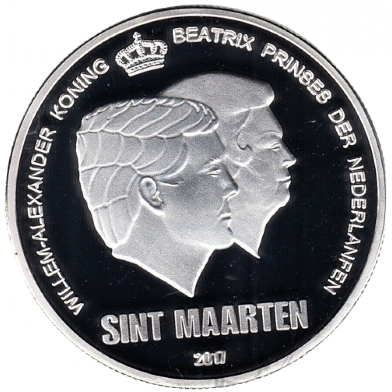 Аверс украшен двойным профильным портретом короля Виллема-Александра и принцессы Беатрикс, обращённых вправо. По окружности размещена официальная титулатура монархов и надпись «SINT MAARTEN / 2017».